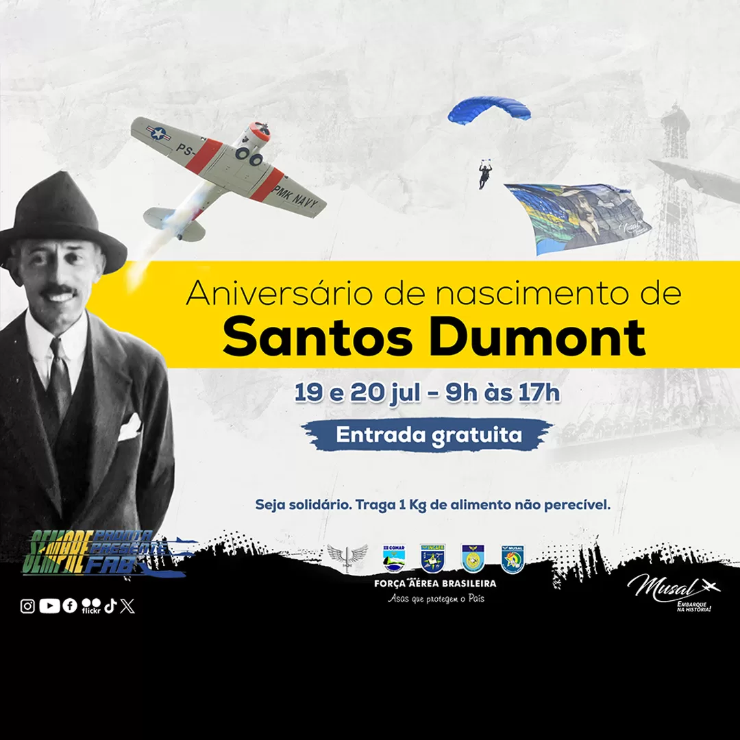 Nos dias 25 e 26 de julho de 2026, o Museu Aeroespacial fará uma grande festa em comemoração ao seu aniversário e ao aniversário de Santos Dumont. Mais informações em breve!